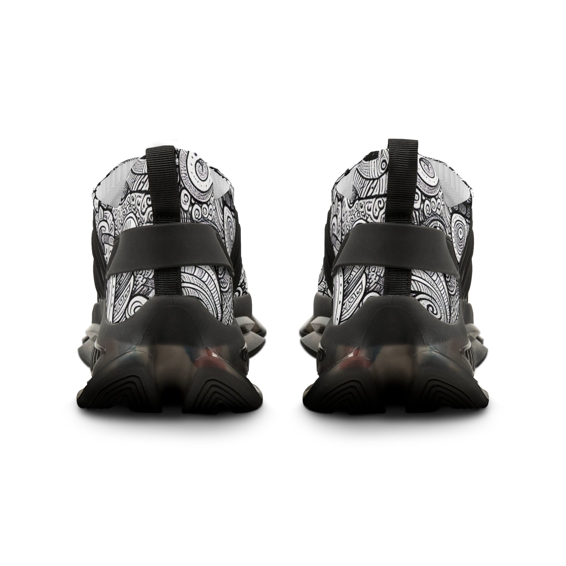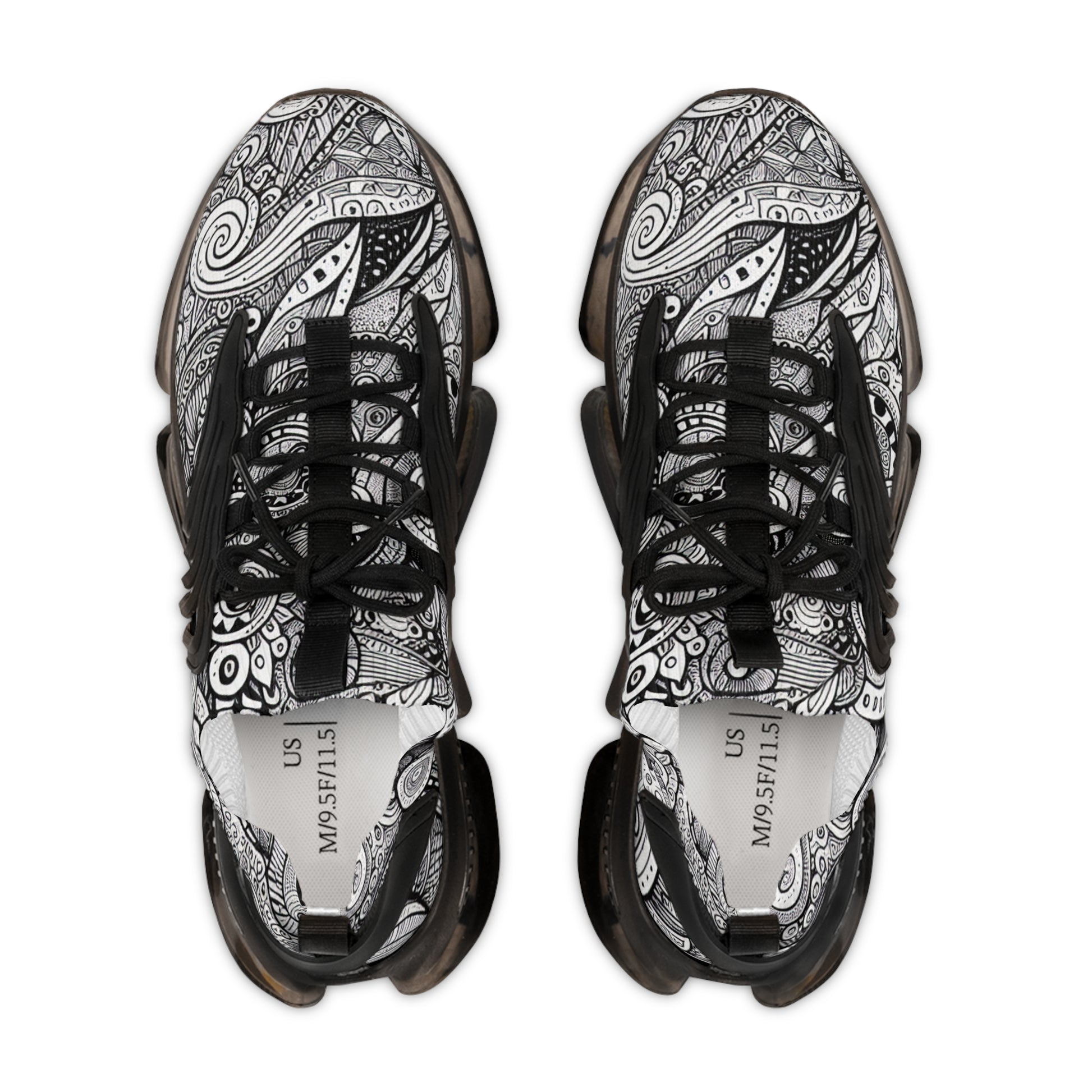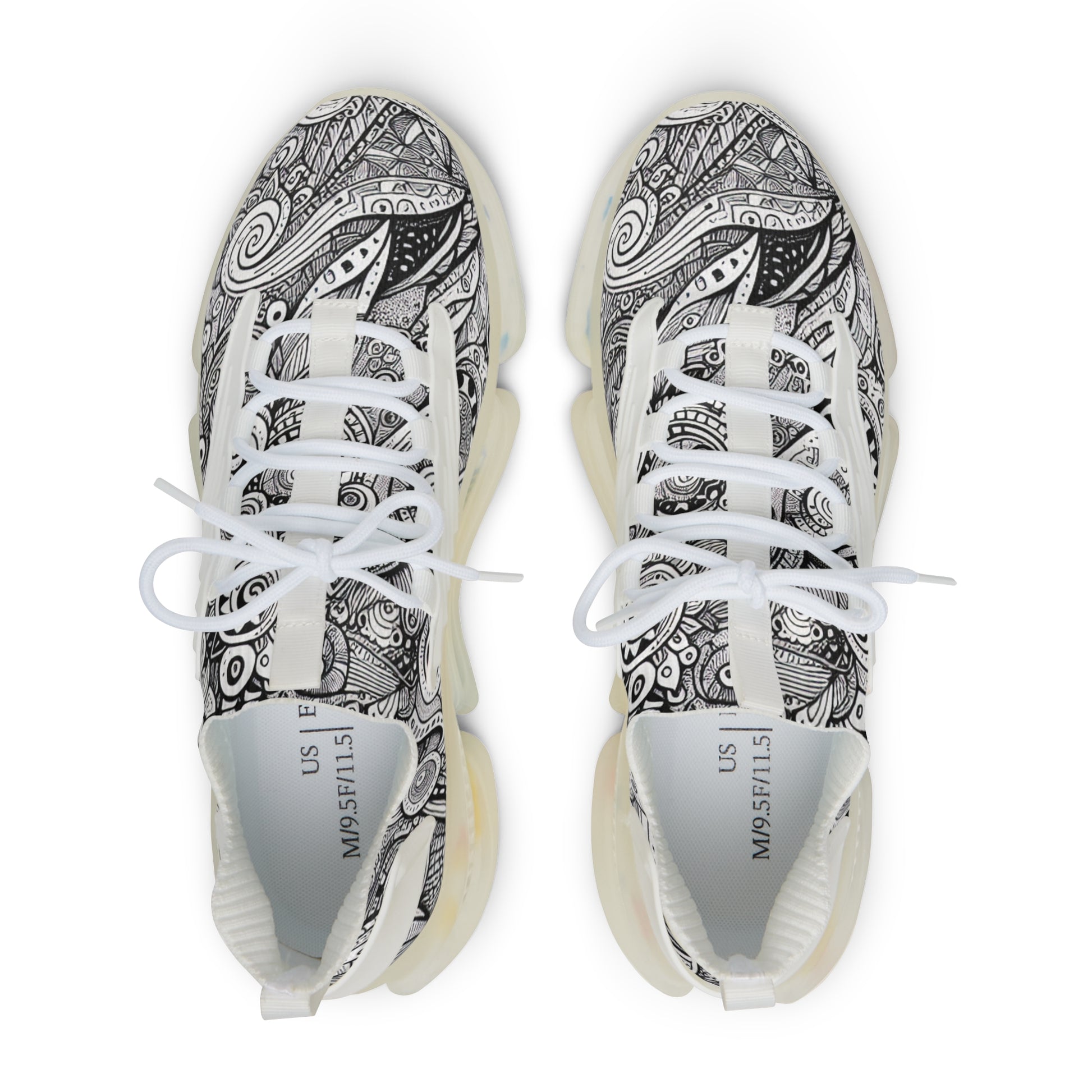 Step into our Mesh Sneakers and step into a universe of intricate doodles. Swirls, geometric shapes, and squiggles dance across, brought to life with spotted details, tiny leaves, stars and contrasting dark regions. It's a testament to the harmonious chaos of life. Expect strong line weights, fine lines, and bold strokes. Get lost in the rhythm and let your feet do the talking. | Unisex Digital Design #MeshSneakers #DoodleDesign #GeometricShapes #SneakerArt #StylishFootwear #UniqueShoes #ArtisticPrint #StreetStyle #FootwearFashion #UrbanChic