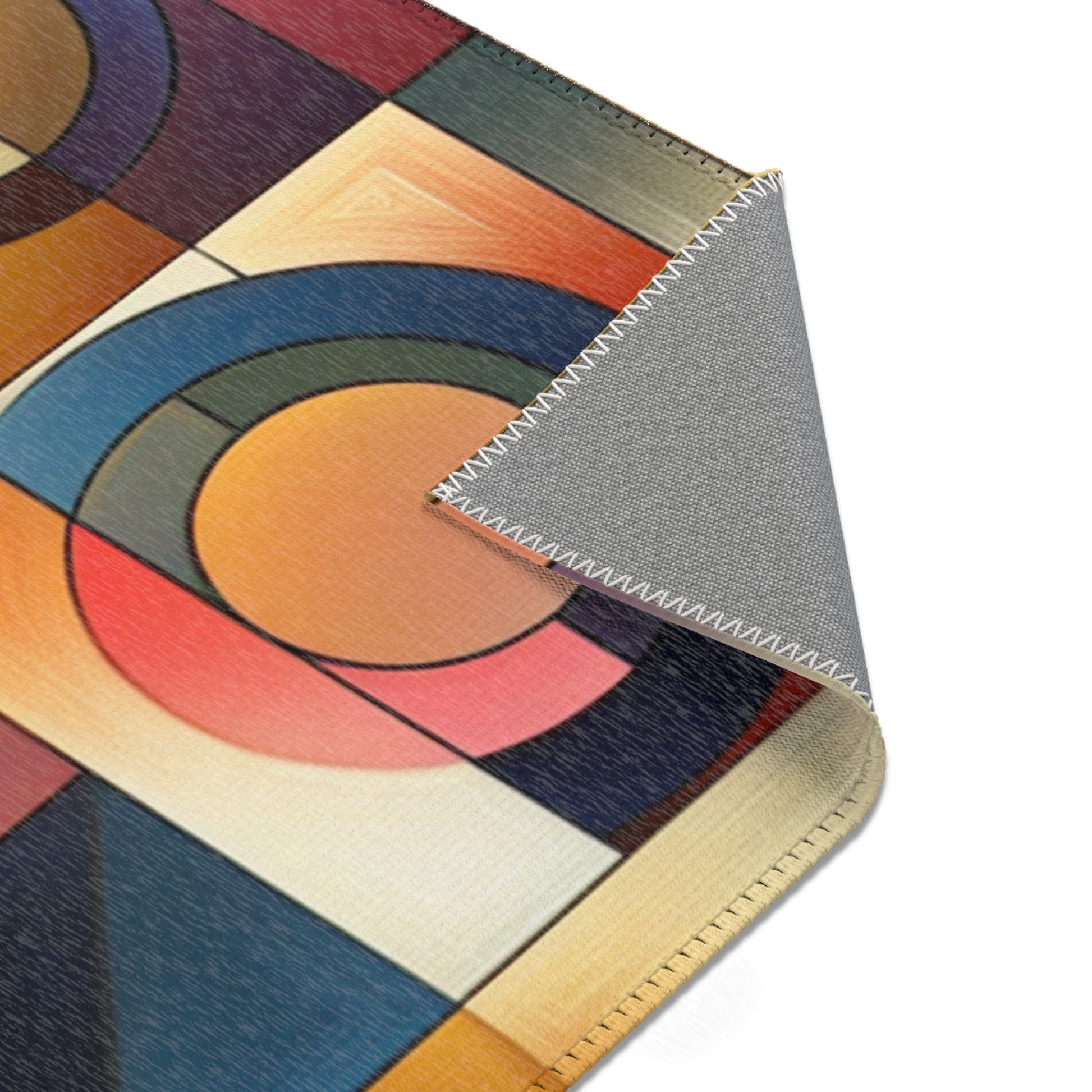 Unleash a vortex of vibrancy onto your floors with our geometric abstract art area rug. Flaunting an interconnected dance of circles, squares, and triangles, this rug's harmonious design spreads rhythm & depth into your space. It flashes a warm gradient background contrasted by cool-hued patterns, turning any room into an art gala. | Digital Design #AbstractArt #GeometricDesign #AreaRug #HomeDecor #BoldInteriors #ArtisticRug #VibrantDesign #HomeStyle #Rugs #InteriorDesign