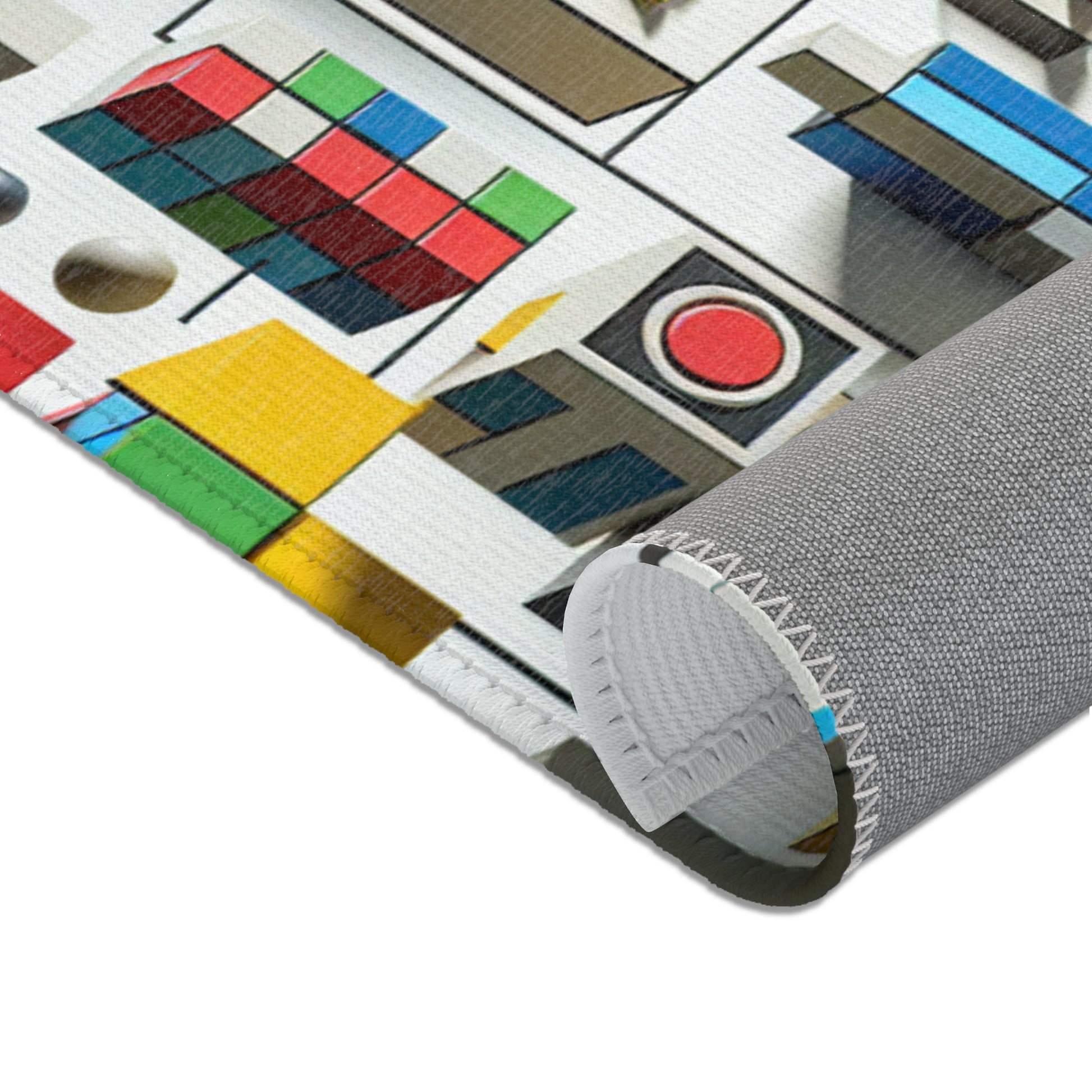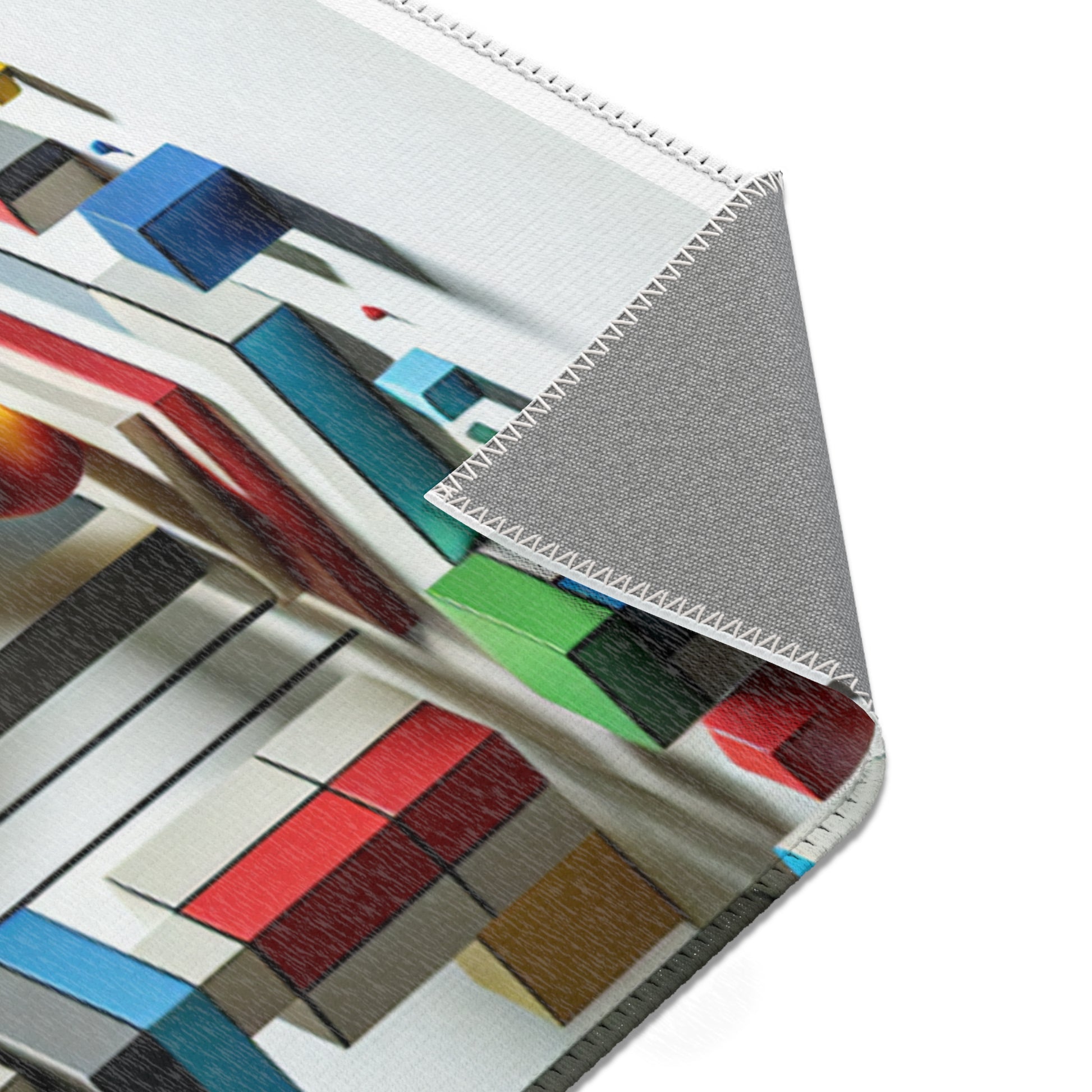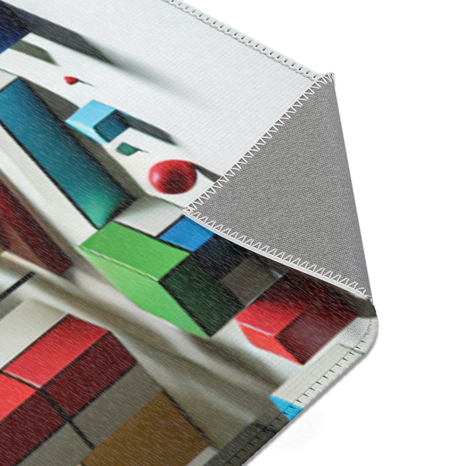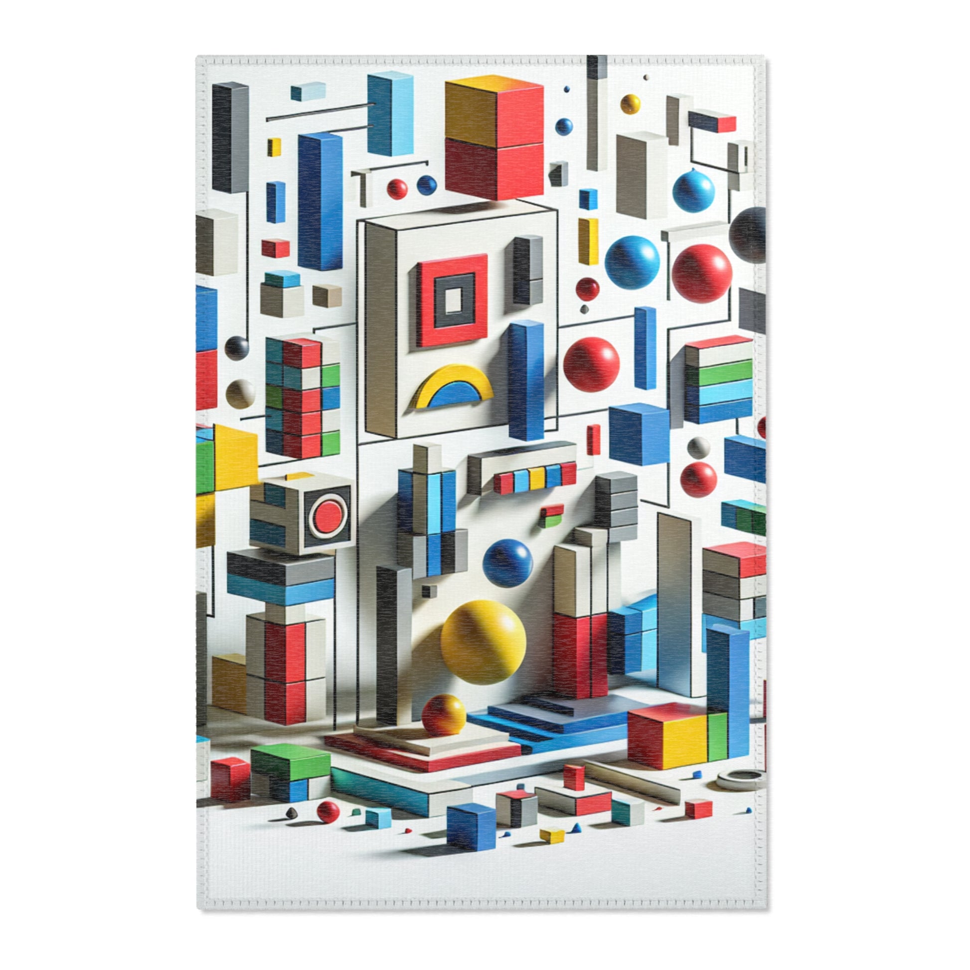 Immerse in vivid art with our abstract geometric area rug! Crafted with vibrant shades of red, blue, green, yellow on a stark white canvas, this rug showcases distinctive shapes like circles, squares, rectangles, each in perfect harmony. Revel in artful sophistication with every step! | Digital Design #AreaRug #HomeDecor #Colorful #Geometric #AbstractArt #Vibrant #Contemporary #LuxuryRugs #InteriorDesign #StyleStatement