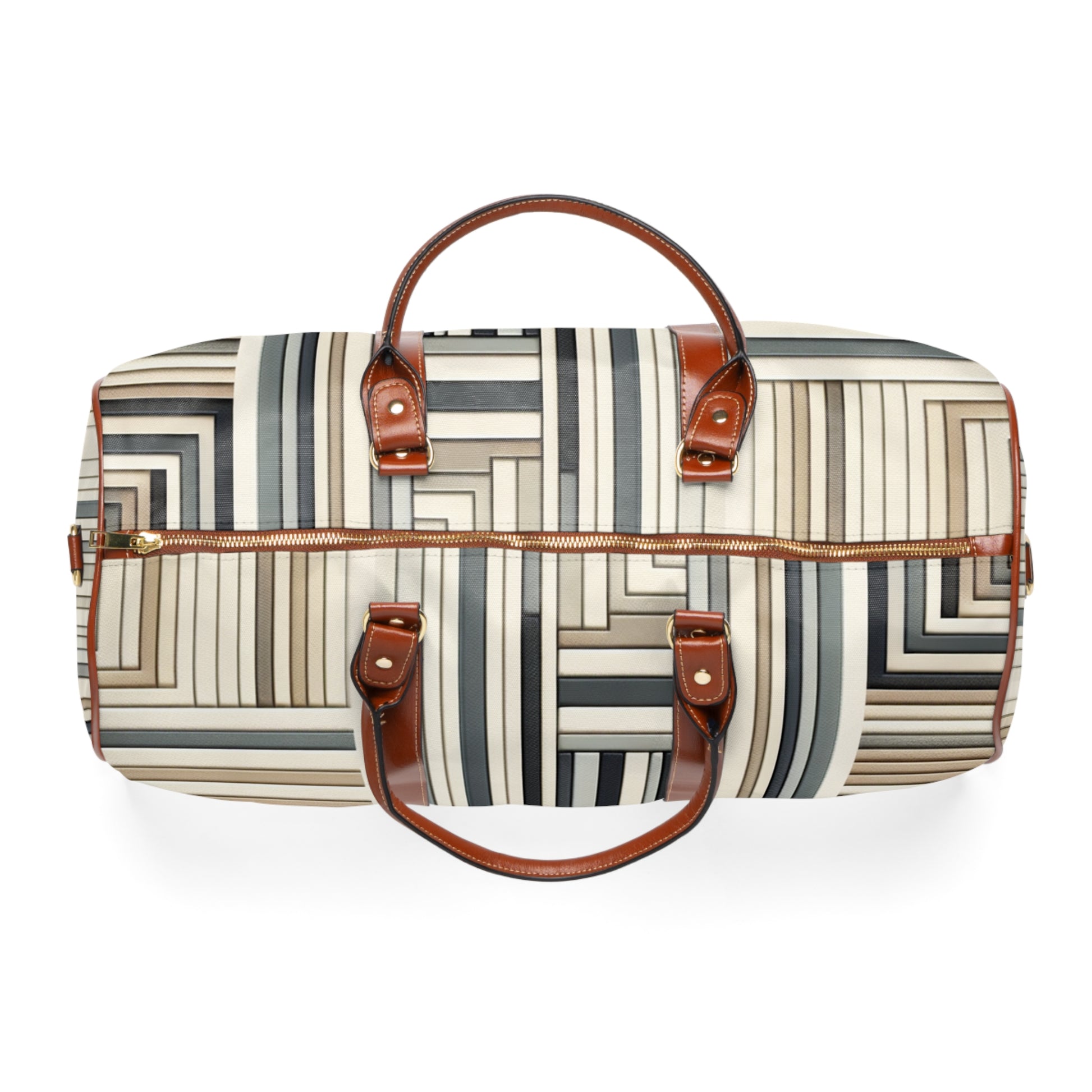 Experience convenience with our waterproof travel bag boasting a stunning neutral-striped design. The play of gray, beige, cream, and white in stripes of varied thickness provides a visually captivating depth. Get ready to turn heads on your next journey with this fashion-forward accessory. | Digital Design #TravelEssential #WaterProof #TravelBag #NeutralPalette #StripeDesign #TravelInStyle #FunctionalFashion #JourneyReady #TravelEquipment #CaptivatingDepth