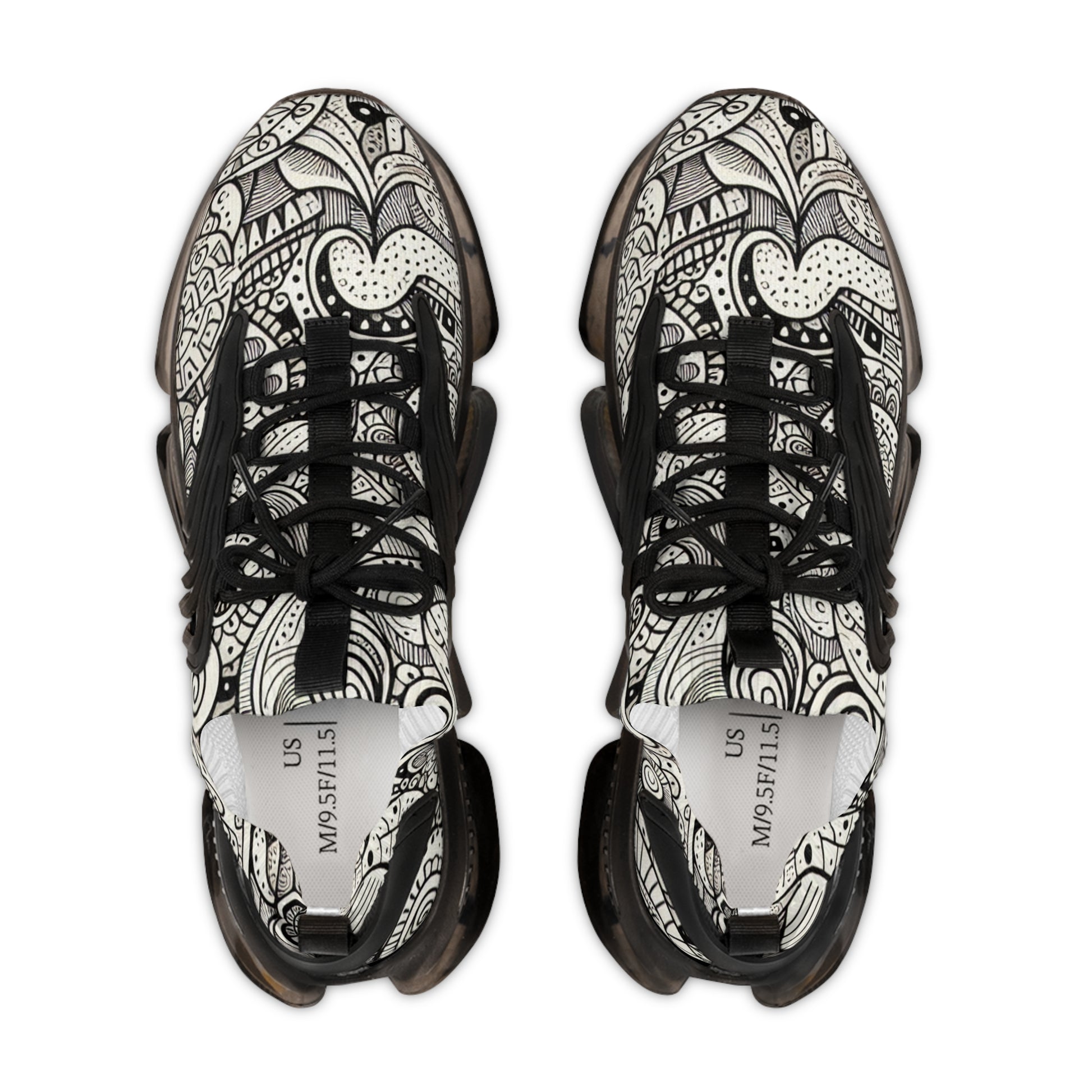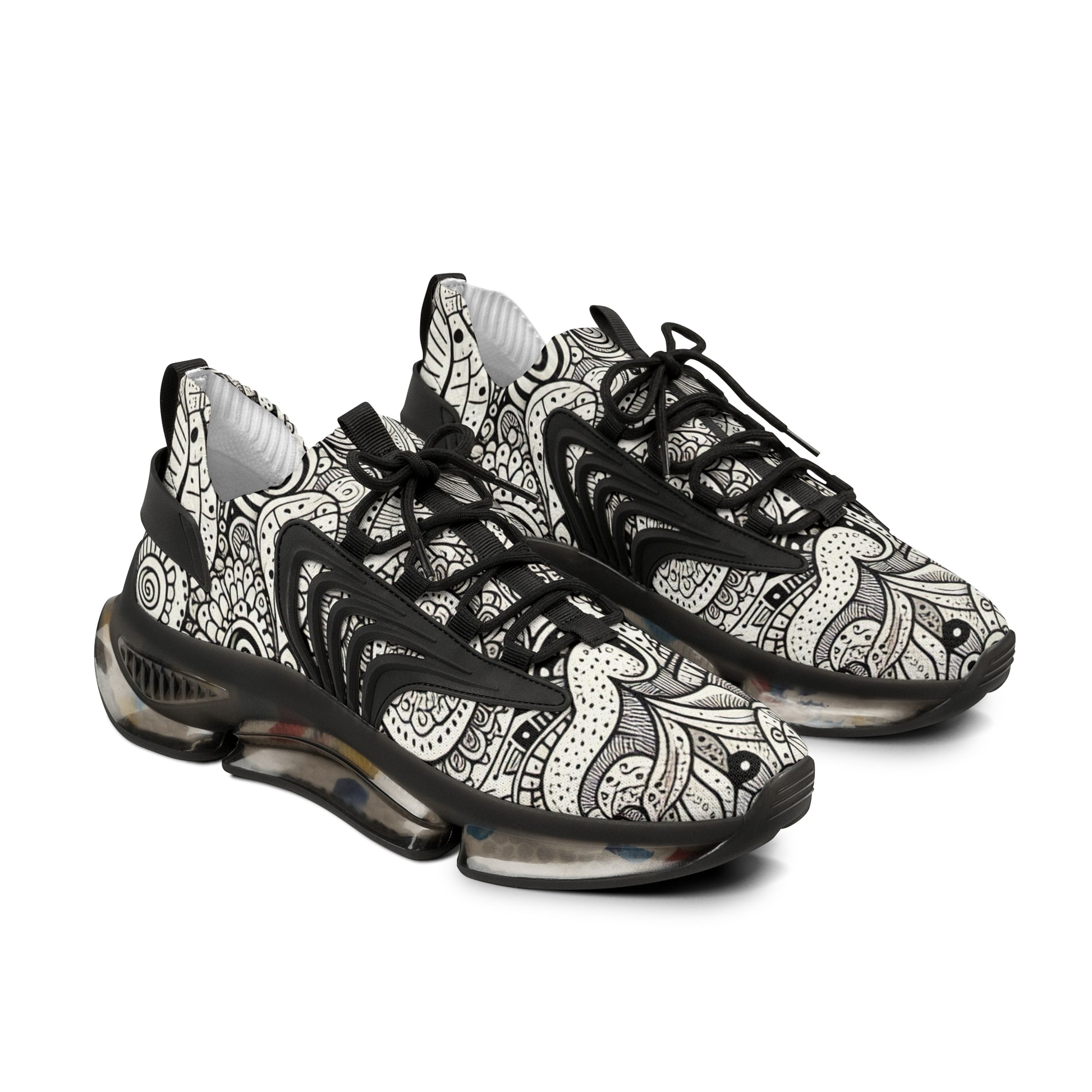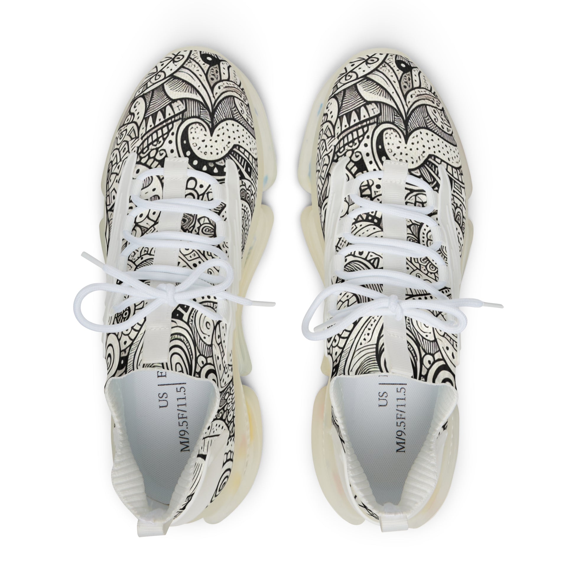 Unleash your quirky side with these mesh sneakers, flaunting a unique doodle pattern. Filled with an array of hand-drawn squiggles, zigzags, spirals, flowers, shapes, and abstract figures, every element is spontaneous, capturing the free-spirited essence of doodle art. Show off your style in comfort! | Unisex Digital Design