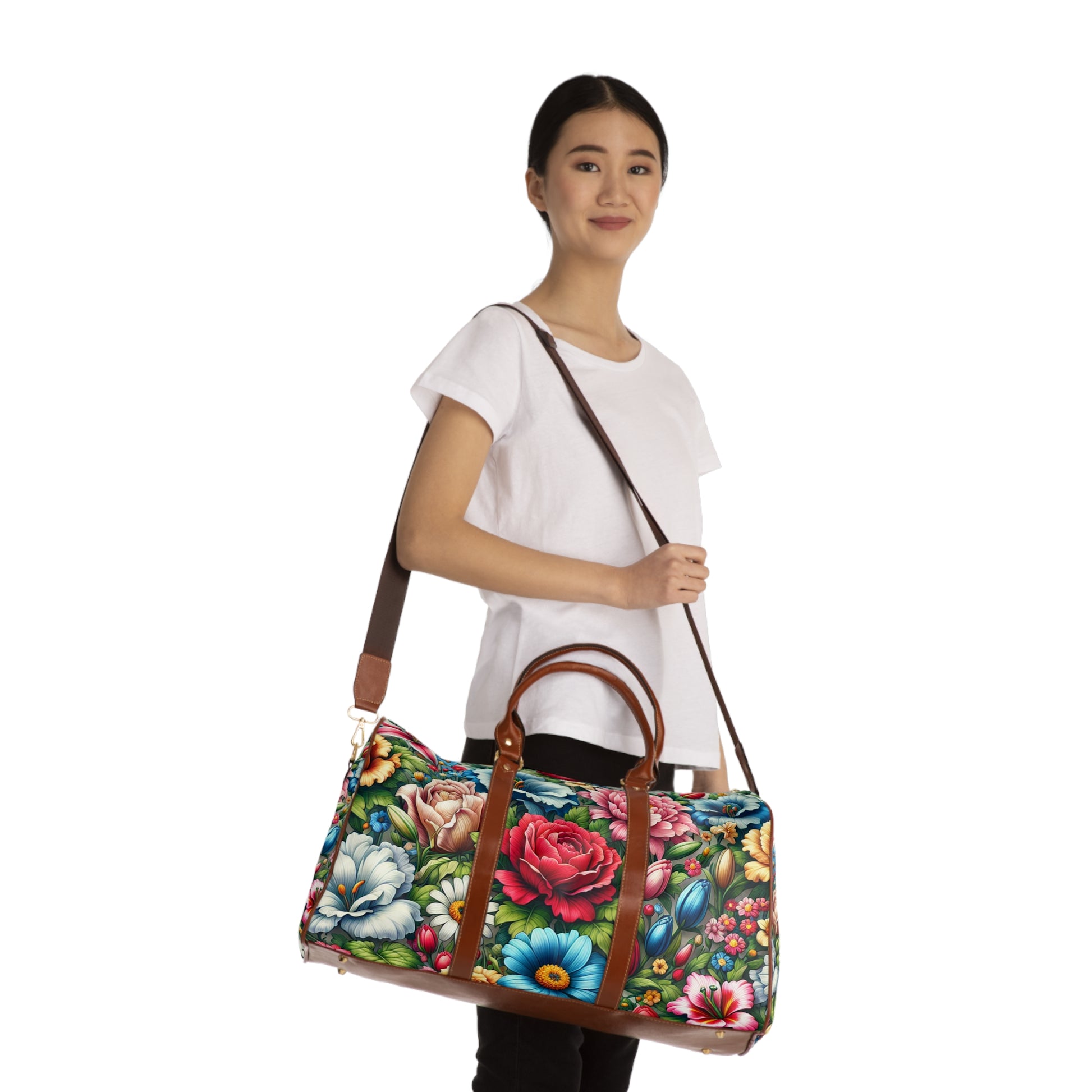 Experience the charming blend of utility and style with our Waterproof Floral Travel Bag. Fashioned with a vibrant display of roses, tulips, daisies, lilies in tones of red, blue, pink, and yellow, this bag is an ode to the beauty of nature. Accented with contrasting green leaves amidst blooming and budding flowers, it's both a travel companion and a fashion statement. | Digital Design #TravelBag #FloralDesign #Waterproof #FashionMeetsFunction #Roses #Tulips #Daisies #Lilies #NatureInspired #TravelInStyle